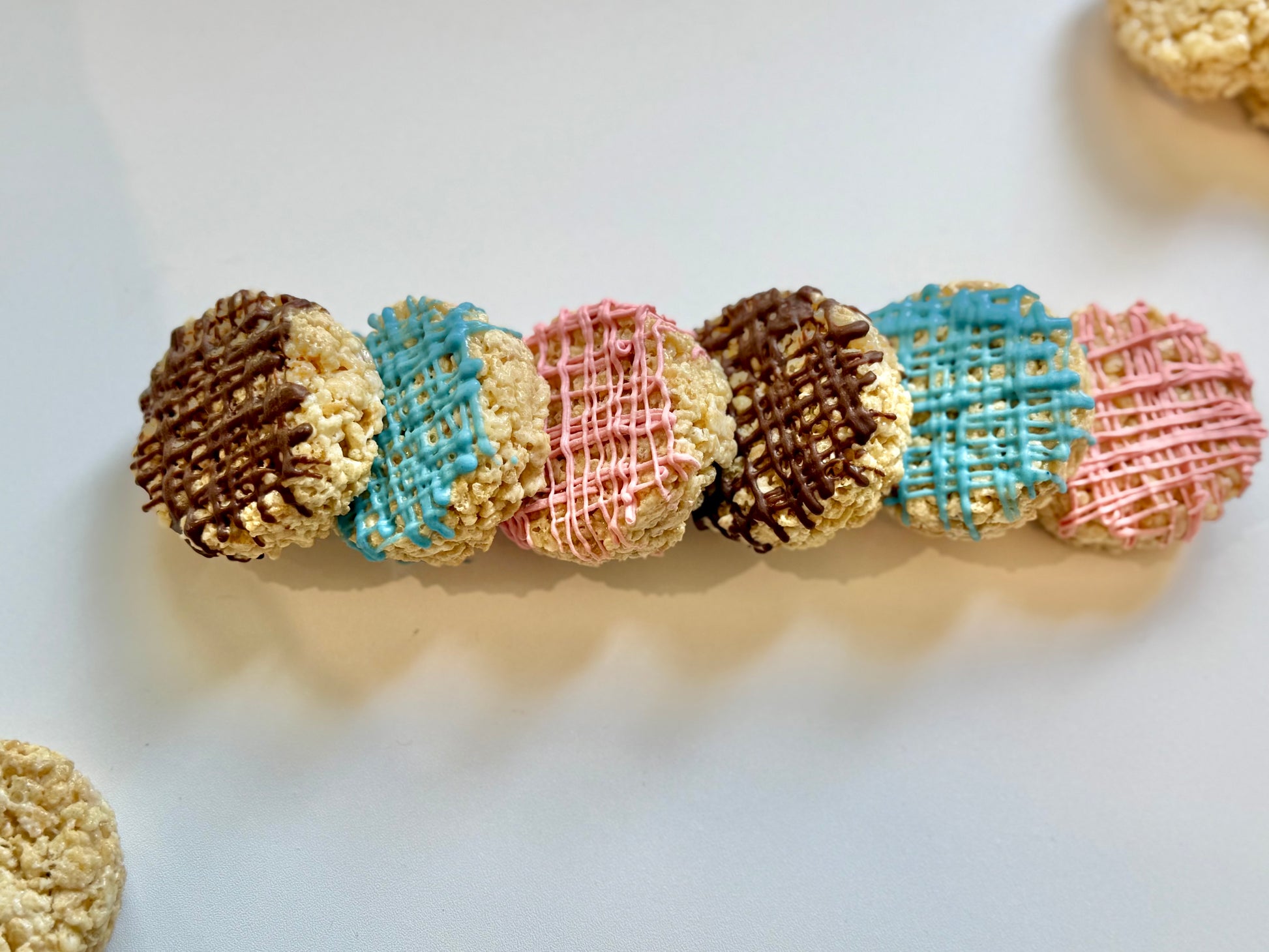 Gourmet crispy rice treats, offering a delectable experience of marshmallow goodness! Your choice of chocolate drizzle